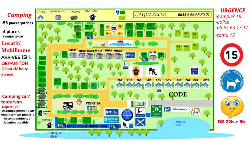 53 emplacements et 4 emplacements pour camping-cars : Ombragés, ensoleillés ou mi-ombre et mi-soleil.